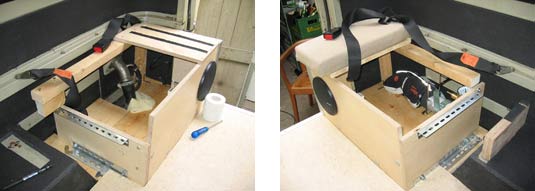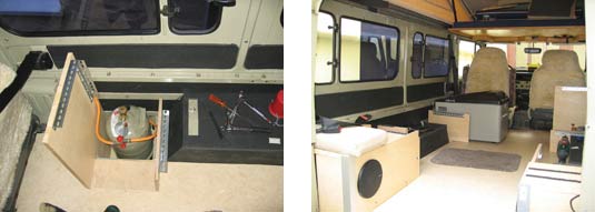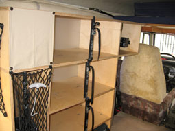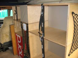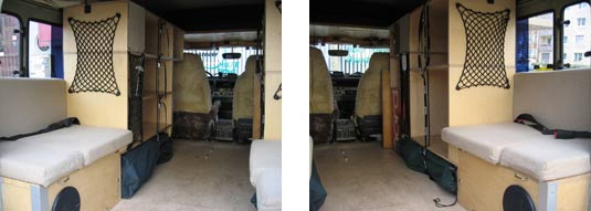 Die beiden Schrankteile sind so im Auto eingebaut, dass sie mit relativ geringem Aufwand ausgebaut werden k�nnen. Ansonsten ist jeder Schrank an 8 Punkten mit dem Fahrzeugboden oder den stirnseitigen Oberkanten der Radk�sten verbunden. Bevor die Schr�nke eingebaut wurden, habe ich die Seitenscheiben in diesem Bereich mit schwarzer Folie bezogen damit man nicht von Au�en gegen die R�ckw�nde schaut.