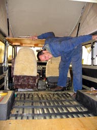 Die beiden Sitzplätze wurden direkt im Heck platziert und auf beiden Seiten des Cruisers ordnete ich jeweils zwei 40cm tiefe Schränke an, die gleichzeitig mit als Bettkonstruktion dienen und bei "abgebautem Bett" als Arbeits- und Kochfläche zur Verfügung stehen. So wird auch erreicht, dass nicht zu viel Gewicht hinter die Heckachse kommt und man bequem durch die rechte Tür ein- und aussteigen kann.