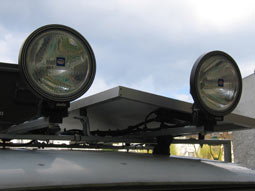 habe ich noch zwei kleine Seitenscheinwerfer am Dachträger befestigt.
