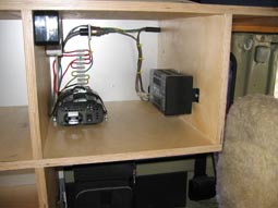 Im Schrankteil über der Kühlbox befindet sich die "Elektrozentrale". Hier sind das Netzgerät für die Engel-Box, ein kleiner 12/ 220 Volt-Gleichstrominverter und das Solarladegerät untergebracht. Falls mal ein 220 Volt Stromanschluss zur Verfügung steht, hab ich hier noch 3 Schuko-Steckdosen eingebaut.