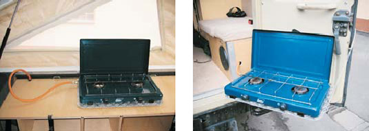 Hinter dem rechten Schrank wurden zwei Gasleitungen verlegt. Die eine führt direkt vom Gasschrank aus nach oben, wo über einen Schnellkupplung der Gaskocher angeschlossen werden kann. Hier hat man dann eine richtig gute "Küchenzeile" mit einer Arbeitshöhe von 110 cm. Die zweite Gasleitung endet im rechten Sitzbankkasten. Hier kann ebenfalls der Gaskocher angeschlossen werden, wenn er draußen verwendet wird. Hierzu habe ich eine kleine Konstruktion gebaut, die an der rechten Hecktür befestigt wird.